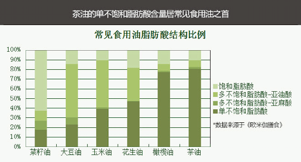 茶油主要成份是:油酸、亞油酸和亞麻酸為主的不飽和脂肪酸。亞油酸和亞麻酸的比例適當,營養均衡,還不含芥酸和山崳酸,富含維生素E和山茶苷,耐貯藏,不易酸敗,不產生人體致癌的黃曲霉素。 其中不飽和脂肪酸含量達90%左右,單不飽和脂肪酸含量達85%以上,居各種植物油之冠。